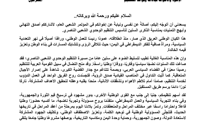 البركاني يهنئ التنظيم الوحدوي الشعبي الناصري بالذكرى الـ60 لتأسيسه