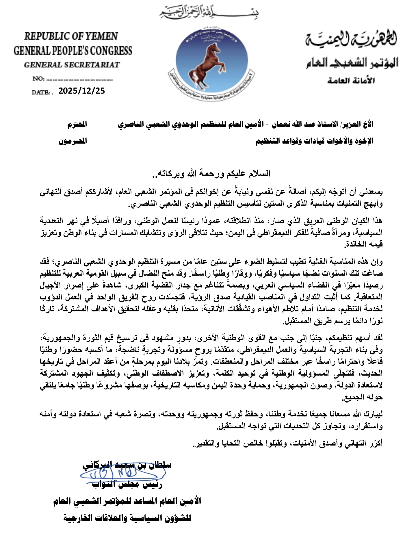 يسعدني أن أتوجّه إليكم، أصالةً عن نفسي ونيابةً عن إخوانكم في المؤتمر الشعبي العام، لأشارككم أصدق التهاني وأبهج التمنيات بمناسبة الذكرى الستين لتأسيس التنظيم الوحدوي الشعبي الناصري.